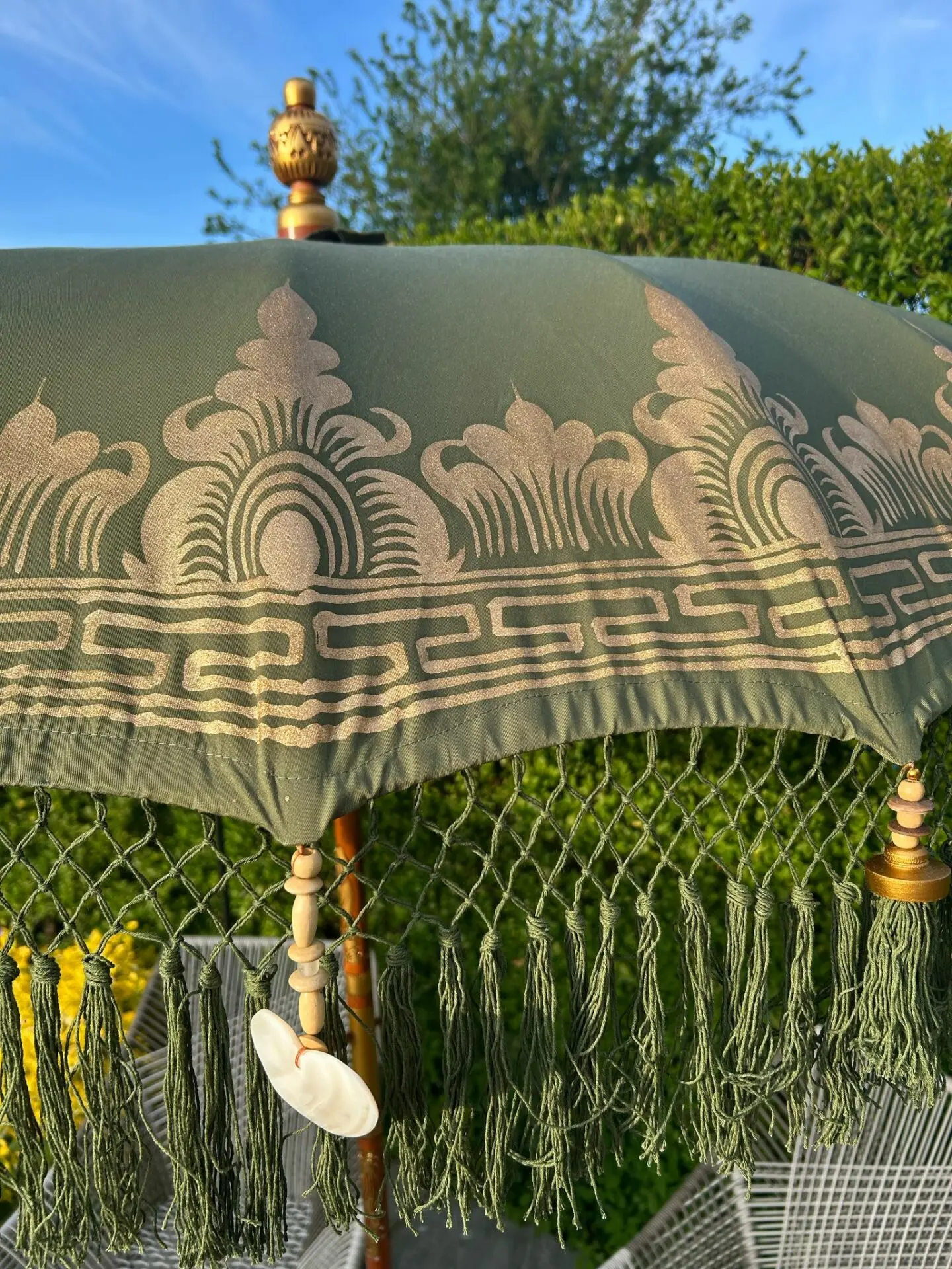 This Handmade Balinese sun parasol has a base colour of Olive Green and is ornately hand-painted in Gold by Balinese artisans.