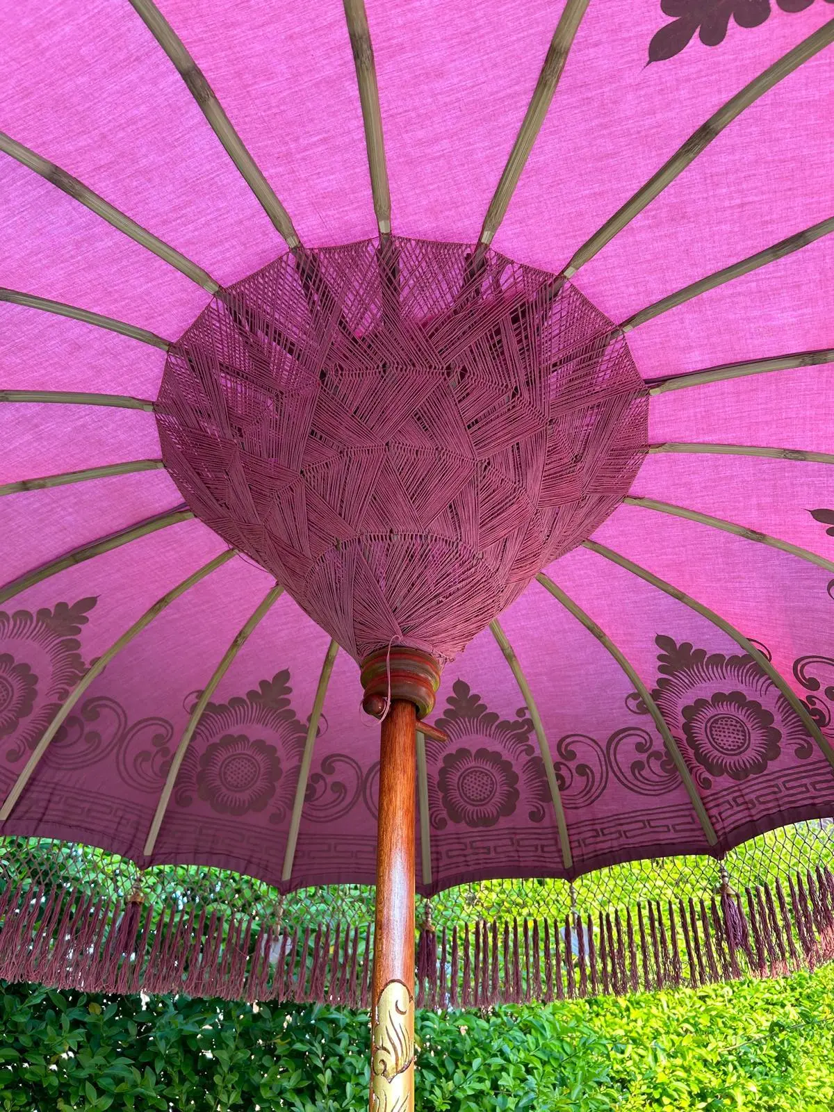 The intricate cotton threading inside is a masterpiece in itself, one which can be admired for hours in the sun. We recommend this parasol only be used to shade from the sun and not from showers. The bamboo pole on this parasol is decoratively carved in a traditional Balinese design and painted in gold.