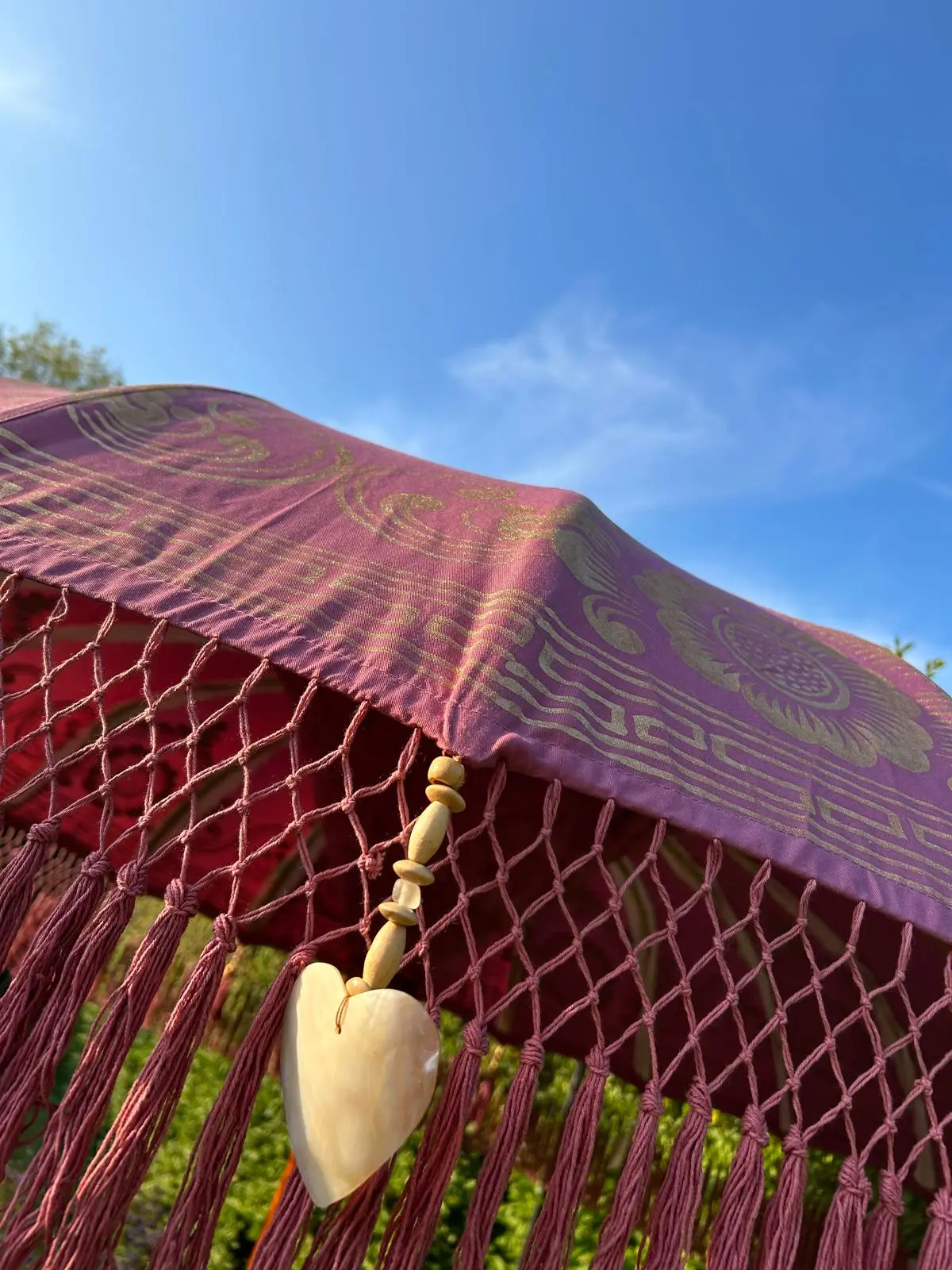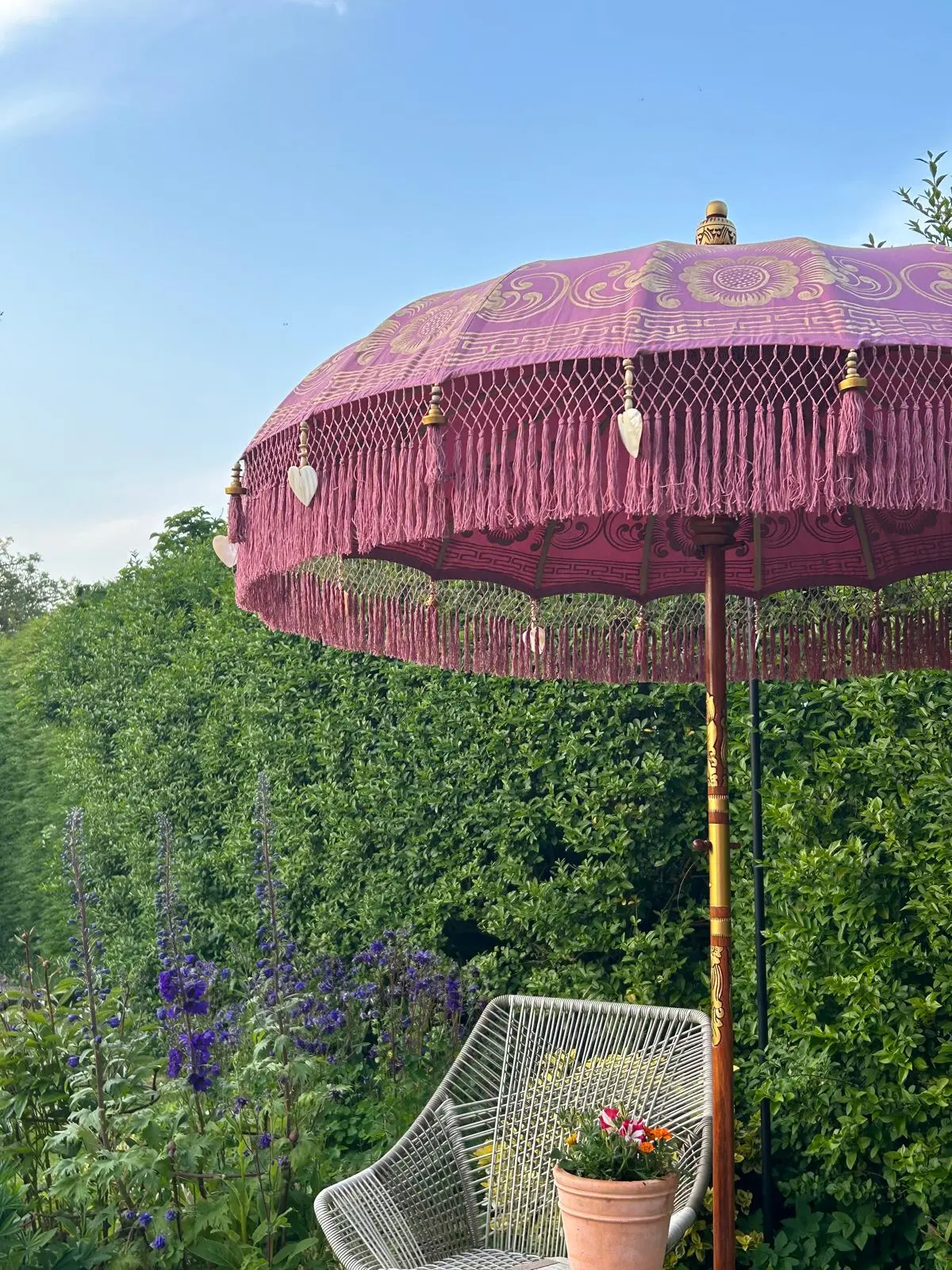 This Handmade Balinese sun parasol has a base colour of Rose and is ornately hand-painted in Gold by Balinese artisans.